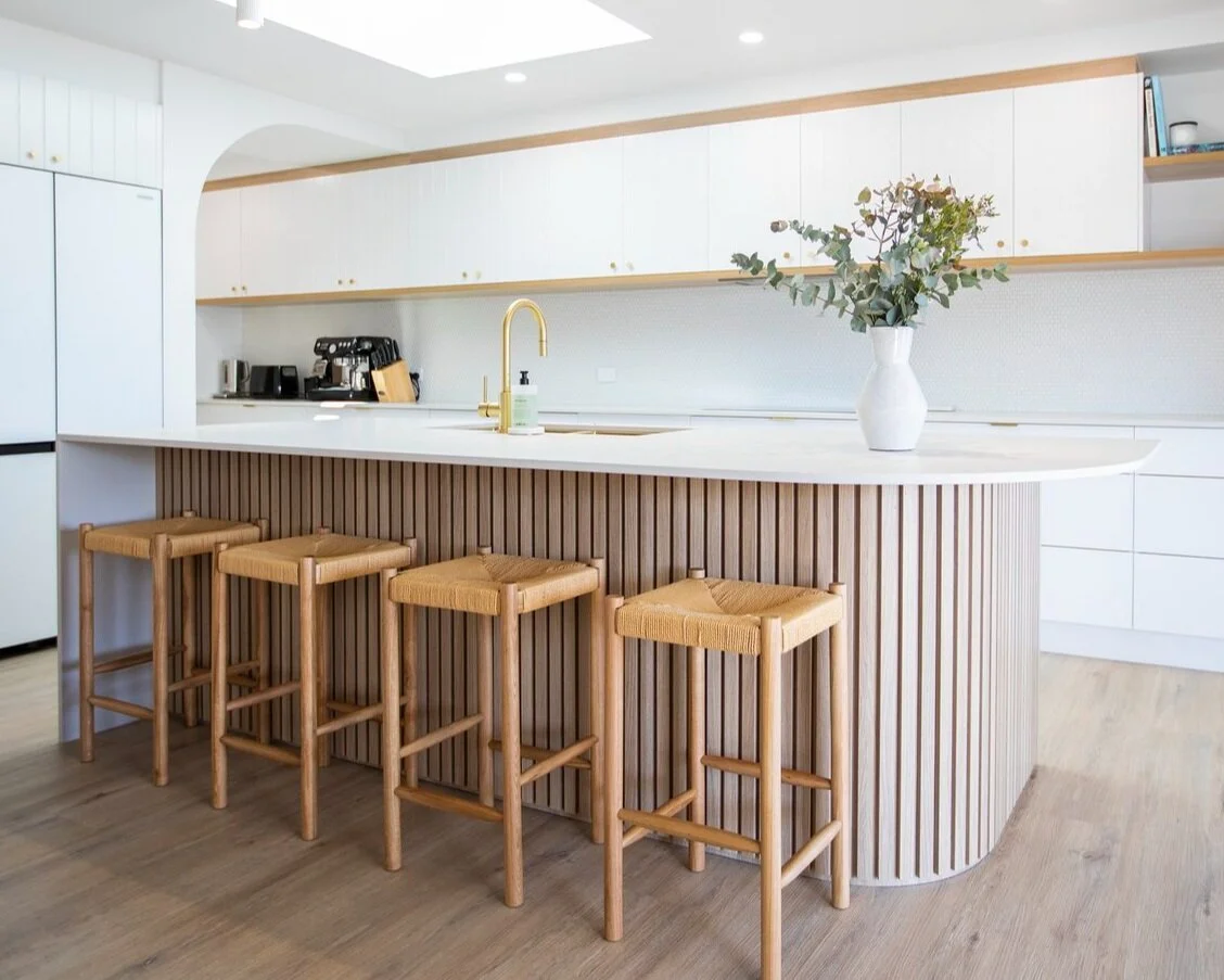 “VJ” stands for vertical joint, so these panels get the most out of your kitchen if you want to add an element of texture without it being distracting. They are much the same as tongue and groove panelling, where the timber or MDF panels are equally spaced. Usually, with the sheets we use, the grooves are cut into them. We often see this type of cabinetry used in coastal-style homes, as they give that fresh and homely feel to any kitchen.