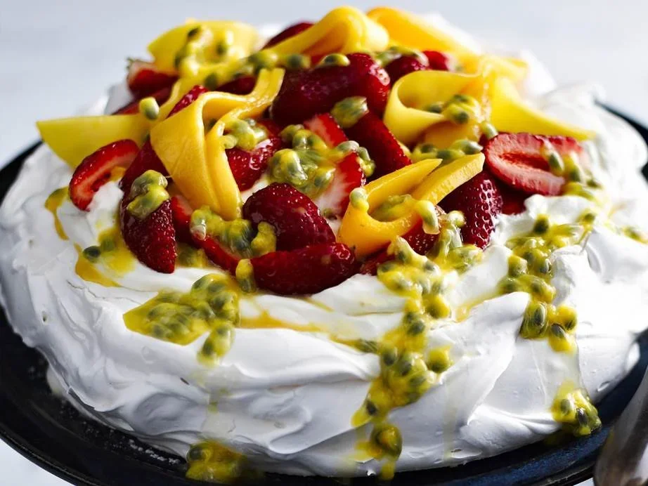 4. Reduce the oven temperature to 100°C (80°C fan-forced). Bake pavlova in the lower half of the oven for 1 1/2 hours or until dry and crisp. Turn off the oven; cool in oven with door ajar. Serve pavlova topped with whipped cream, strawberries, mango and passionfruit.