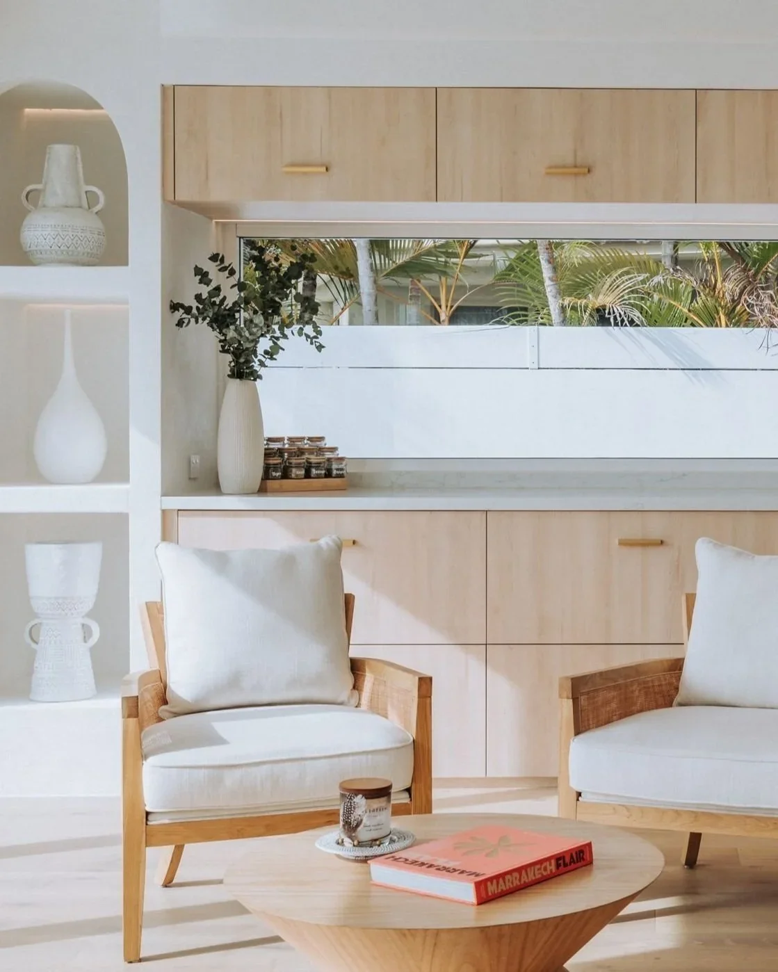The only decoration you’ll want to be on show is the occasional beach-inspired décor. Perhaps a collection of tastefully arranged seashells or a piece of driftwood might elevate the feeling of being at the coast. Natural elements always help to create a more calming and serene atmosphere, and you’ll also be adding a touch of personality to the space. Consider rugs and wooden barstools as well. Clever planning and coordination of your cabinetry mean you can hide your appliances but still gain easy access.