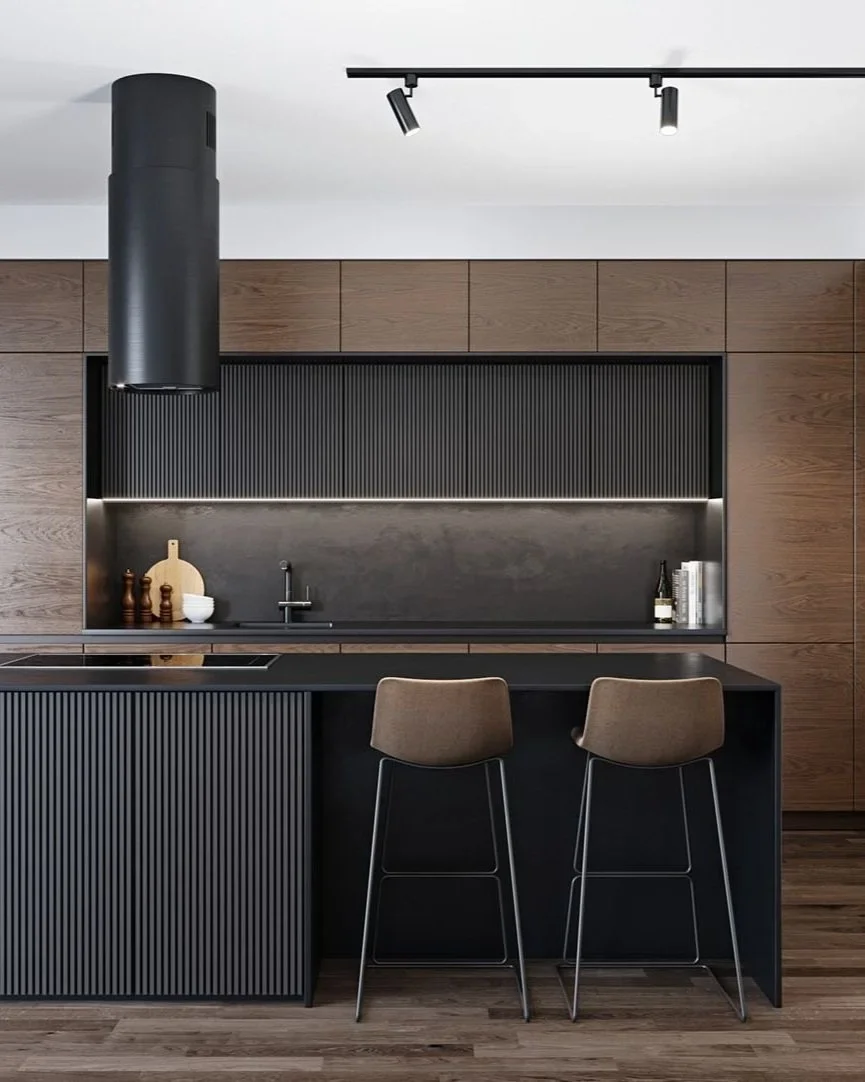 Are you brave enough to have a black kitchen? It’s no doubt that dark kitchens can be an intimidating decision due to their dramatic and bold features. However, a great option to balance out the solid cabinetry is to pair it with a walnut timber laminate. The beautiful woodgrains makes the space feel more warm and inviting without appearing too heavy and dark. Using this colour combination creates a sophisticated and moody atmosphere, perfect for a modern-luxury style home.
