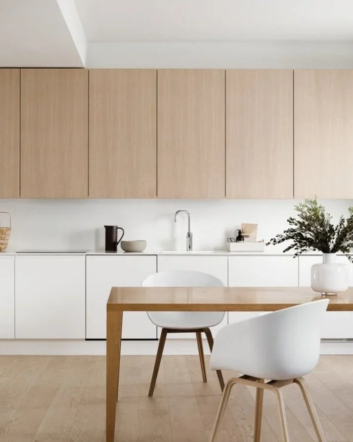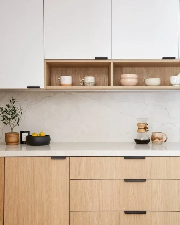 When it comes to creating a blank canvas for your kitchen, white cabinets are the perfect choice. However, if you’re looking to create visual interest then we highly recommend pairing your white cabinets with a light timber laminate. This elegant colour combination is suited to coastal, palm springs and scandi style homes. The advantages of timber laminate cabinetry is that it’s not only wonderful for hiding finger prints, but it also adds a sense of warmth and texture into your space.
