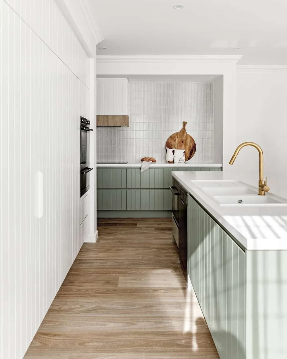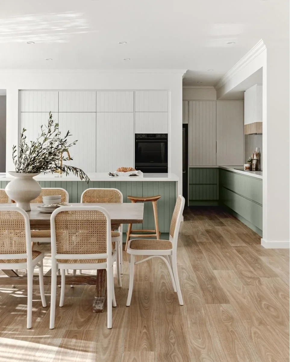 If you wanting to incorporate some colour into your kitchen, but aren't sure what would be a timeless option, we’ve got you covered! Bayleaf from Laminex is a mid-tone soft natural green with a touch of grey and it’s the perfect way to add colour without being too daring. This shade of green is a popular choice for interiors for its serene and modern look. Combine with white cabinetry and accessorise with beautiful brushed brass hardware for a coastal or farmhouse cottage style kitchen.