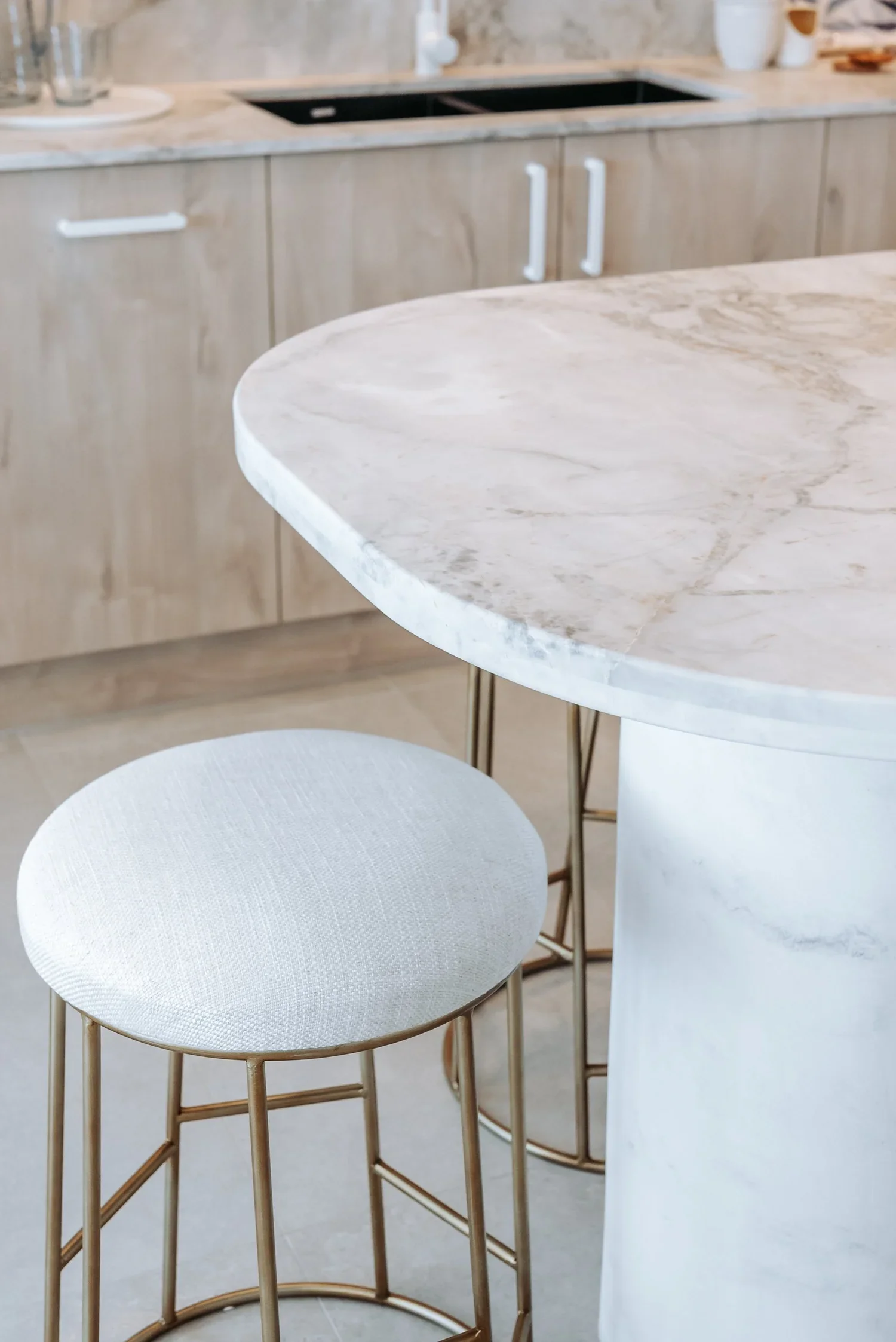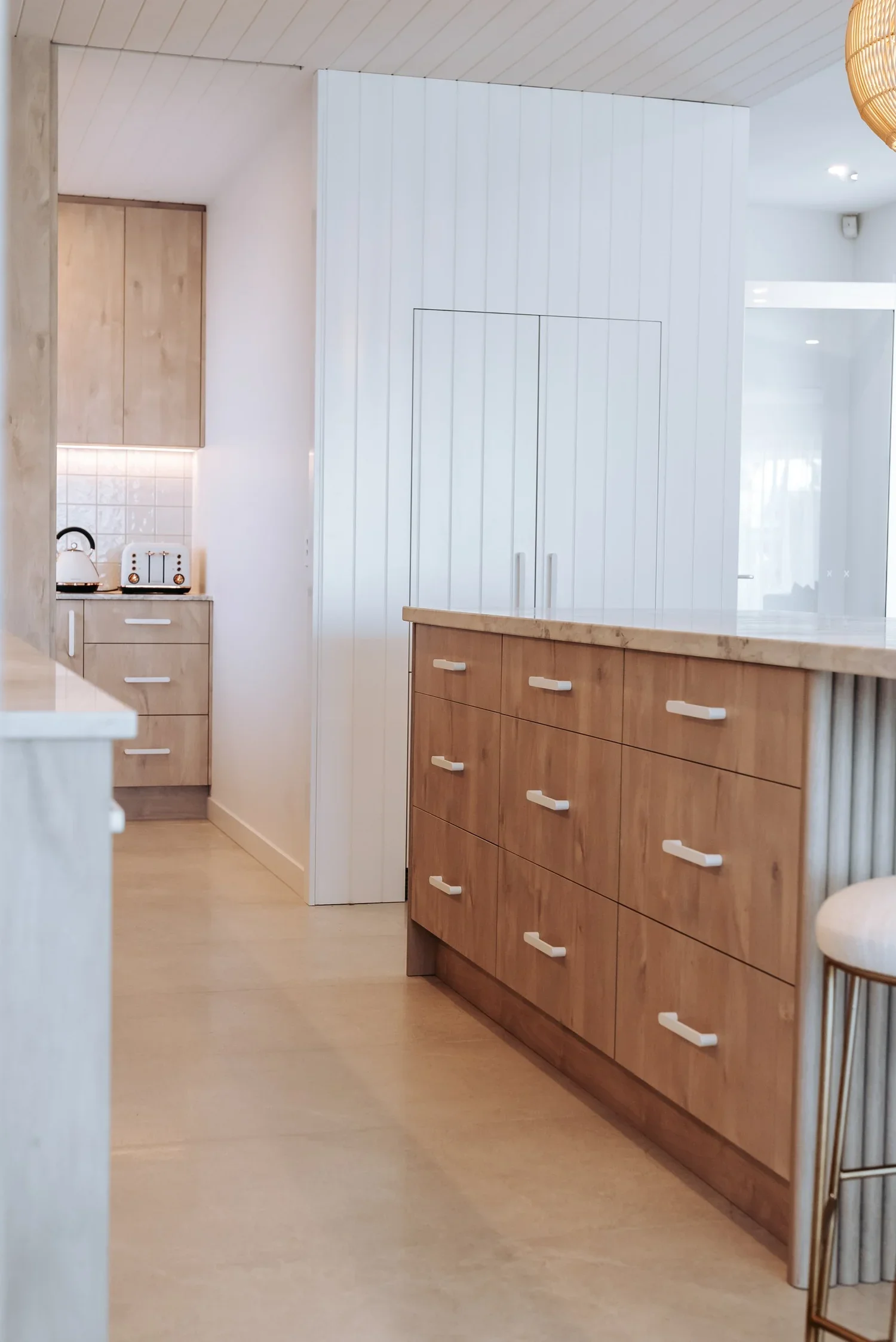 In this stunning coastal-inspired villa, the kitchen has been designed with beautiful joinery in neutral tones to give that feeling of bringing the beachside vibe into the heart of this home. The curved profiles also add to that ambience of a soft and inviting space.