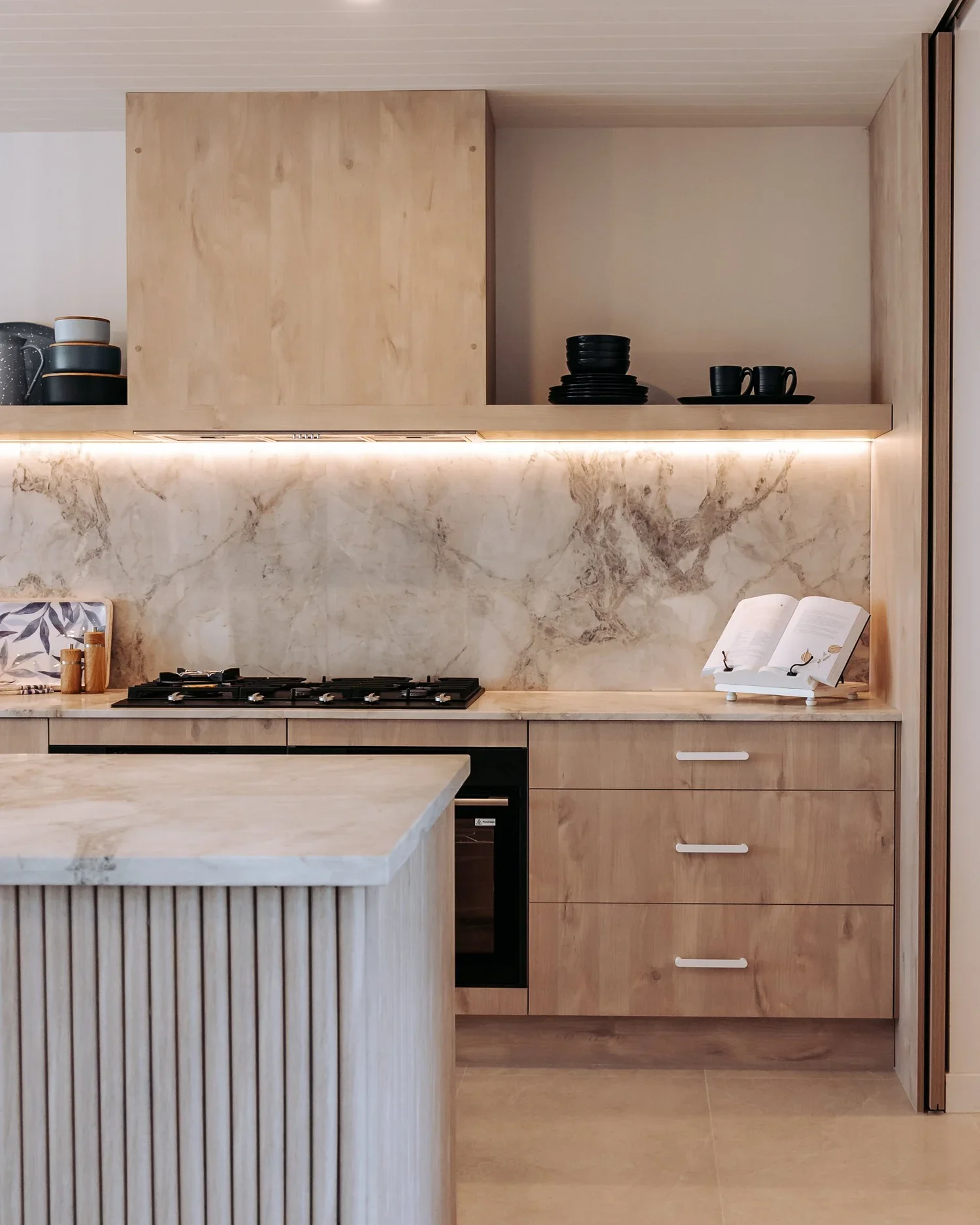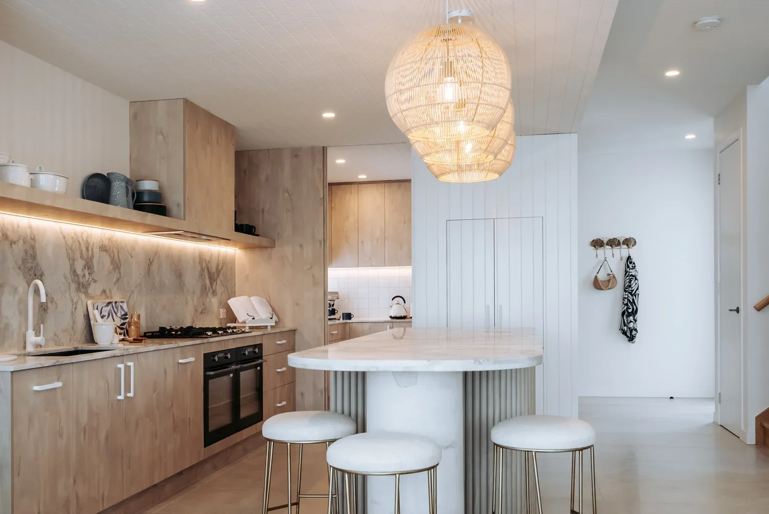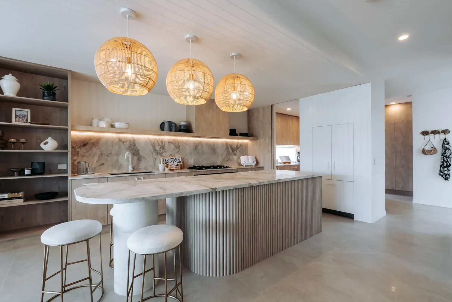 The use of natural materials throughout the kitchen, including the marble countertops and splashback, natural coloured flooring, floating shelf and rattan pendant lights, help to extend that warm and inviting atmosphere.